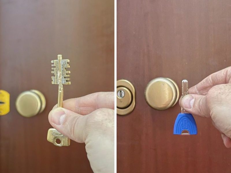 la chiave abbinata ad una serratura a cilindro europeo, oltre ad essere più piccola e compatta, rispetto a quella di una serratura a doppia mappa, è anche più difficile da duplicare.